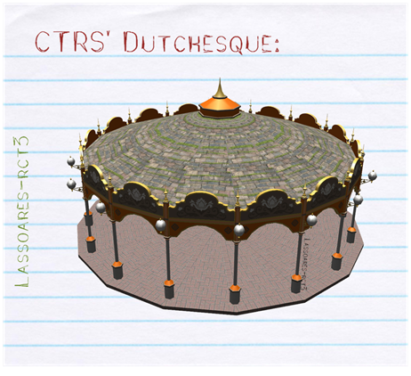 O terceiro grupo é composto por três peças que formam uma bela cobertura para rides que também servirá como um ponto de encontro ou como uma cobertura para praças de alimentação. Para montar tal escrutura, insira primeiro a peça denominada Pavillion (Pavilhão) e a estrutura principal estará colocada, diga-se de passagem o telhado deste pavilhão tem uma das texturas mais bonitas que já vi em CSOs para o RCT3. Depois cooque a peça Pavillion Lamps (Luzes do pavilhão) e bonitos lustres aparecerão junto aos postes que sustentam a estrutura. Por fim, insira a peça Brickstage (Piso de tijolos) e o piso do pavilhão estará colocado. Veja a imagem abaixo e repare como ficará na tela do RCT3.